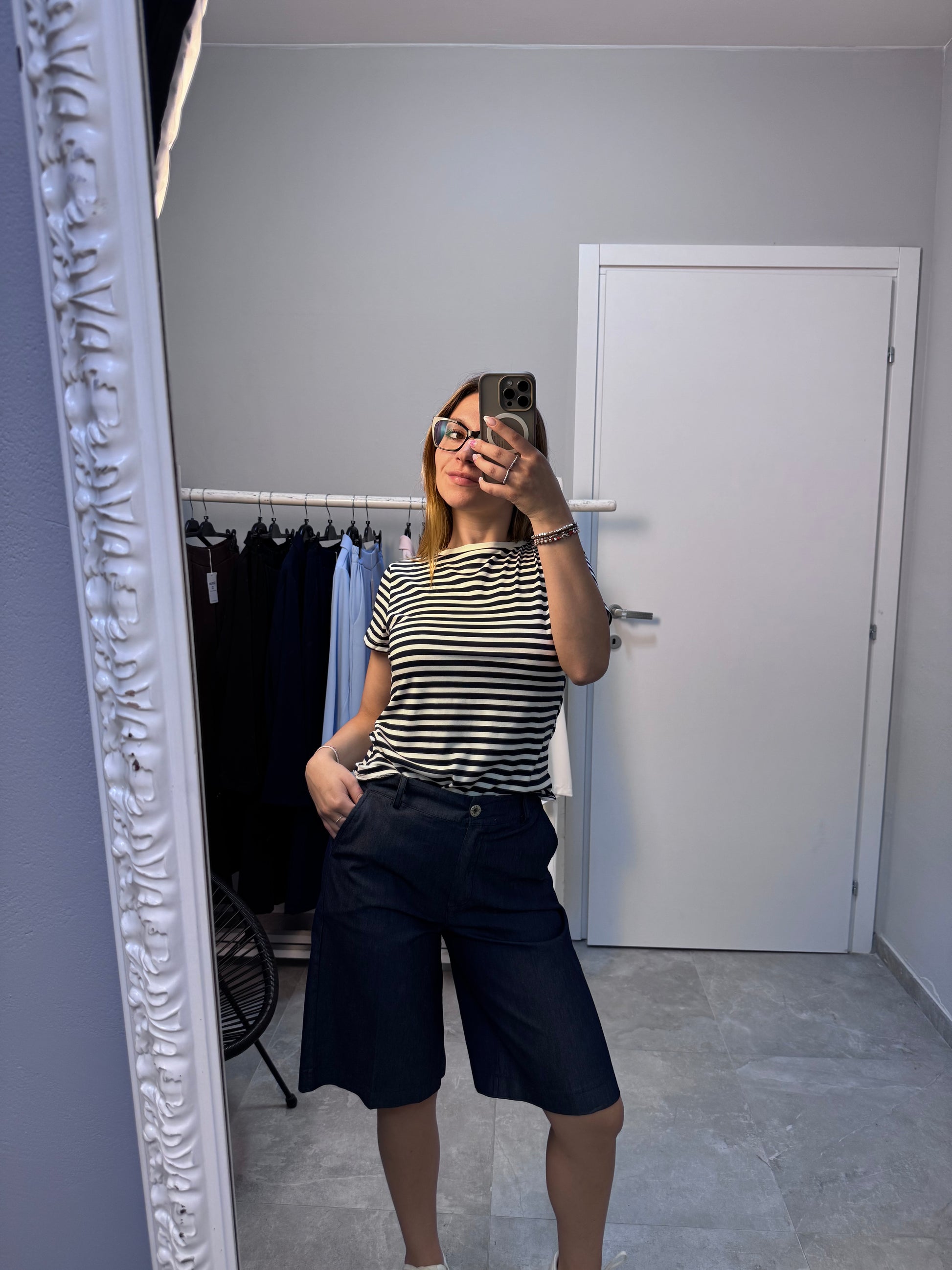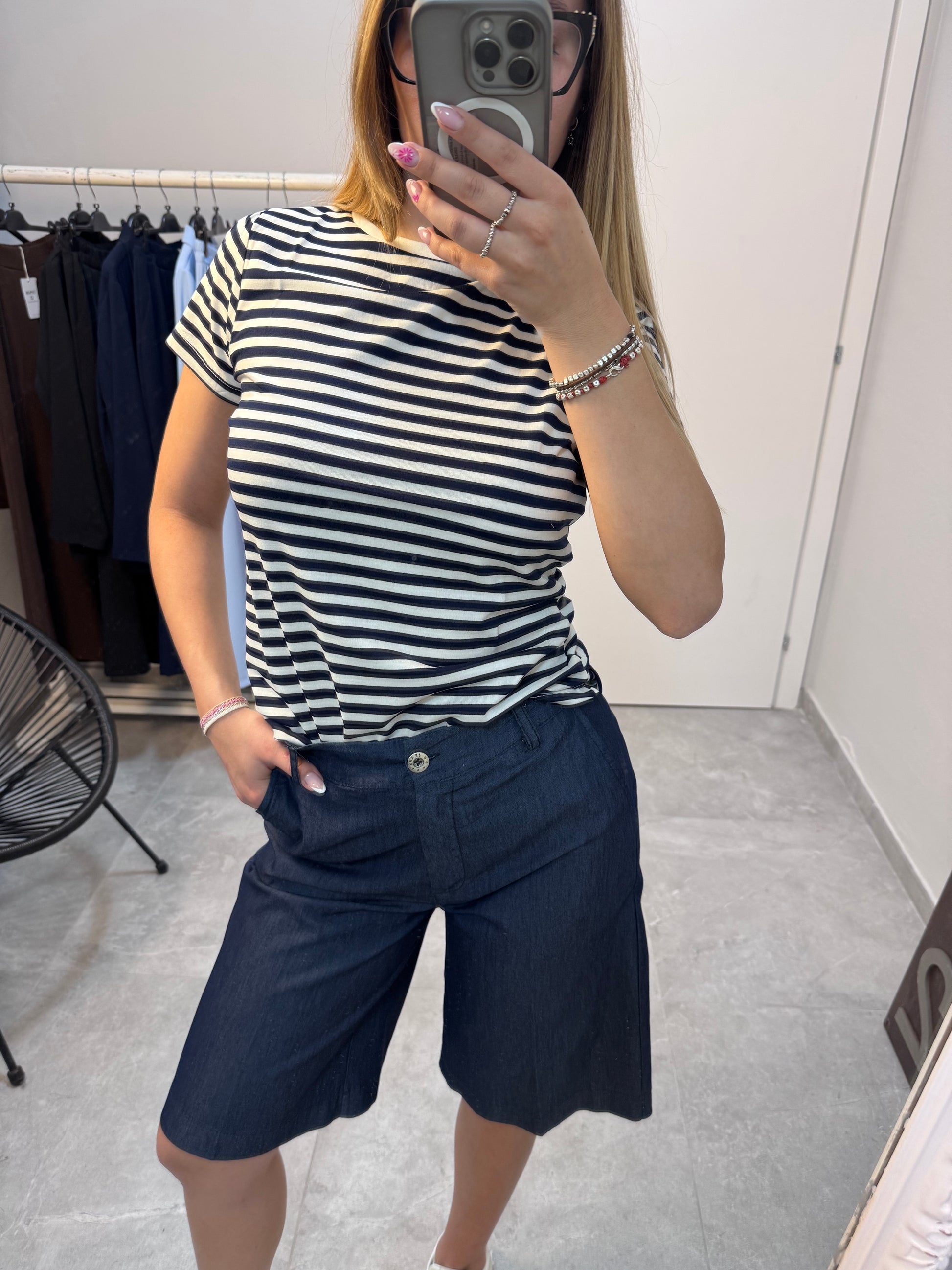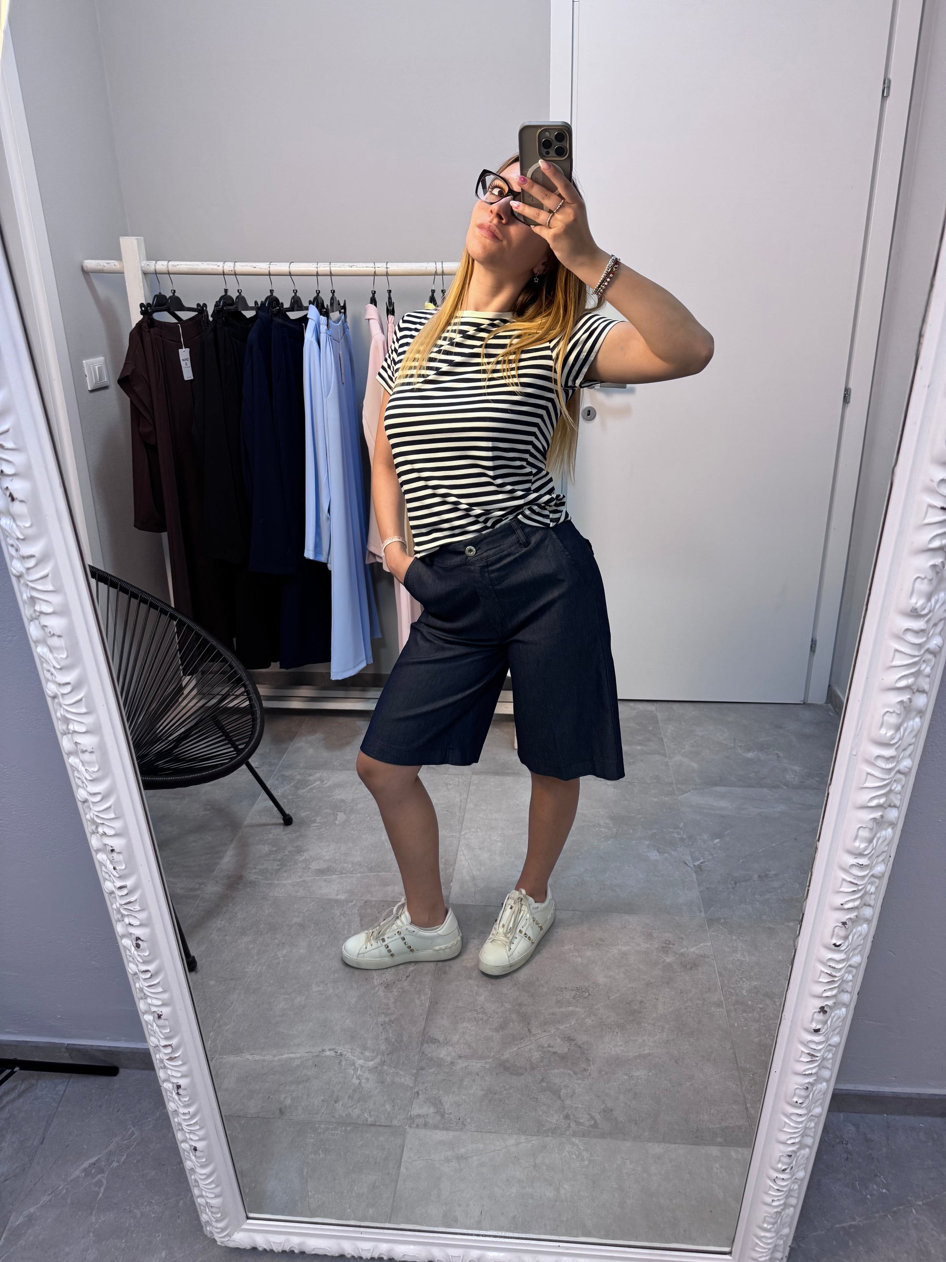 Descrizione: Bermuda lavaggio jeans con bottone in cintura.