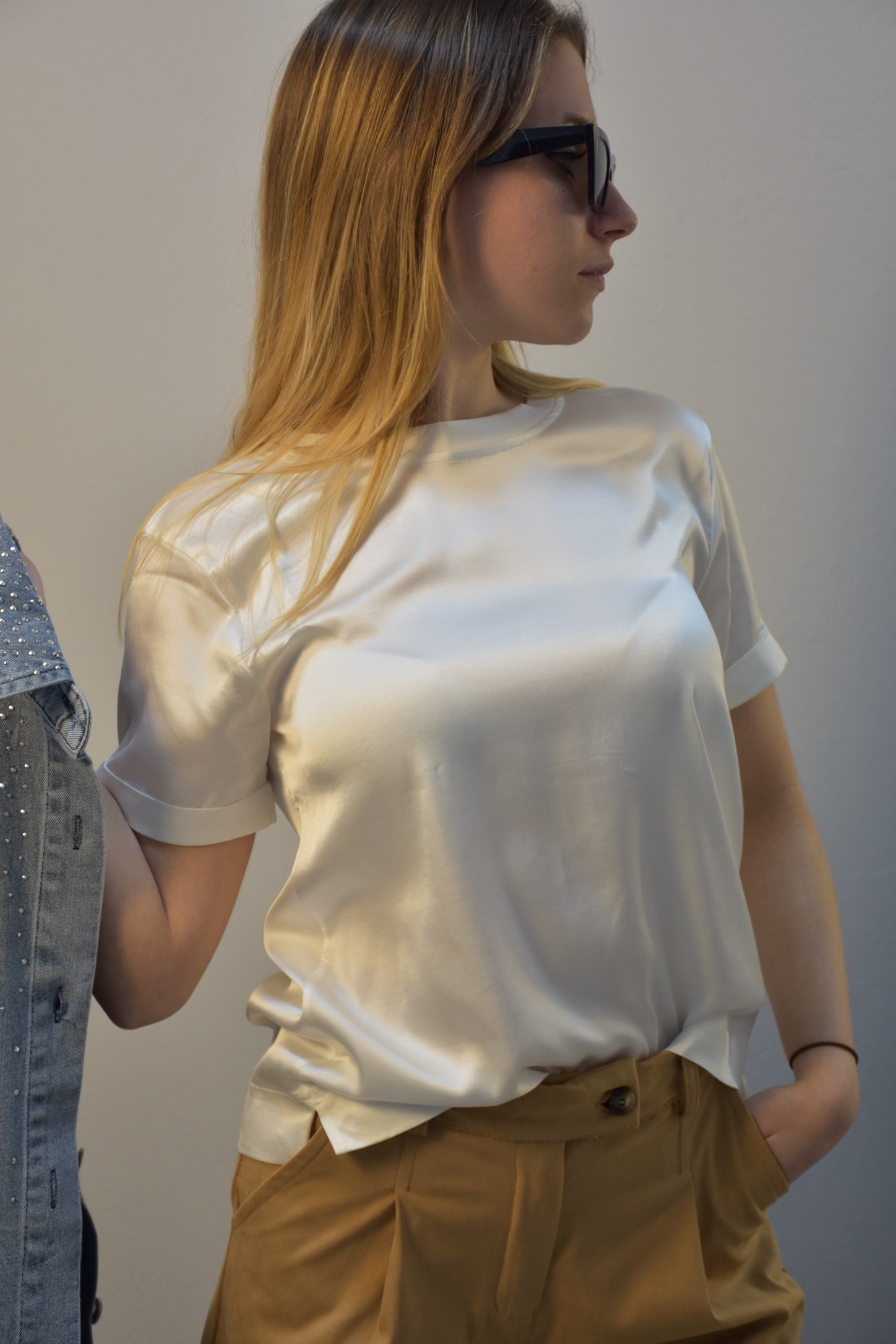 Descrizione: Camicetta in raso di visca. Fresca e leggera. Girocollo. Manica con cucitura.