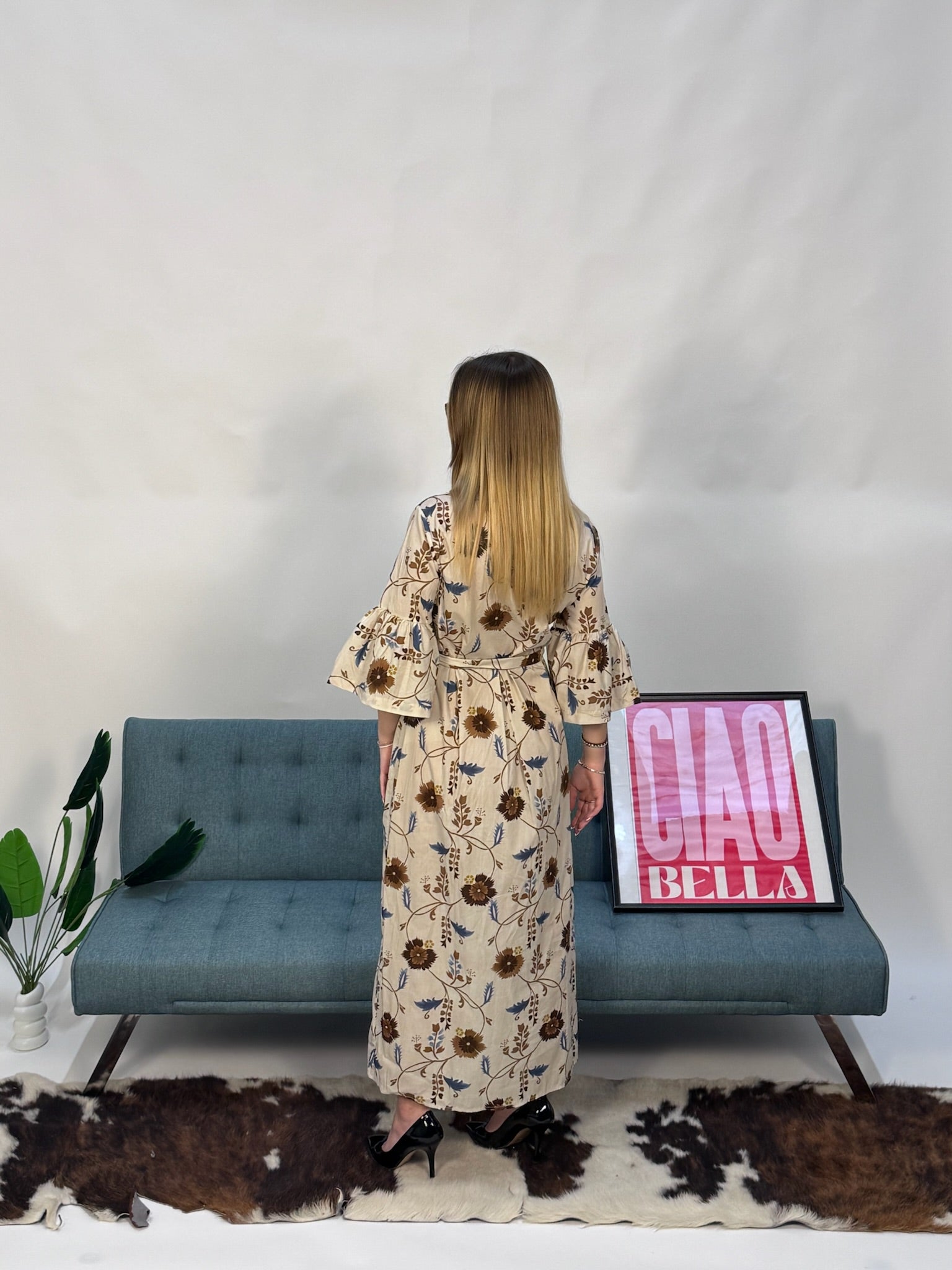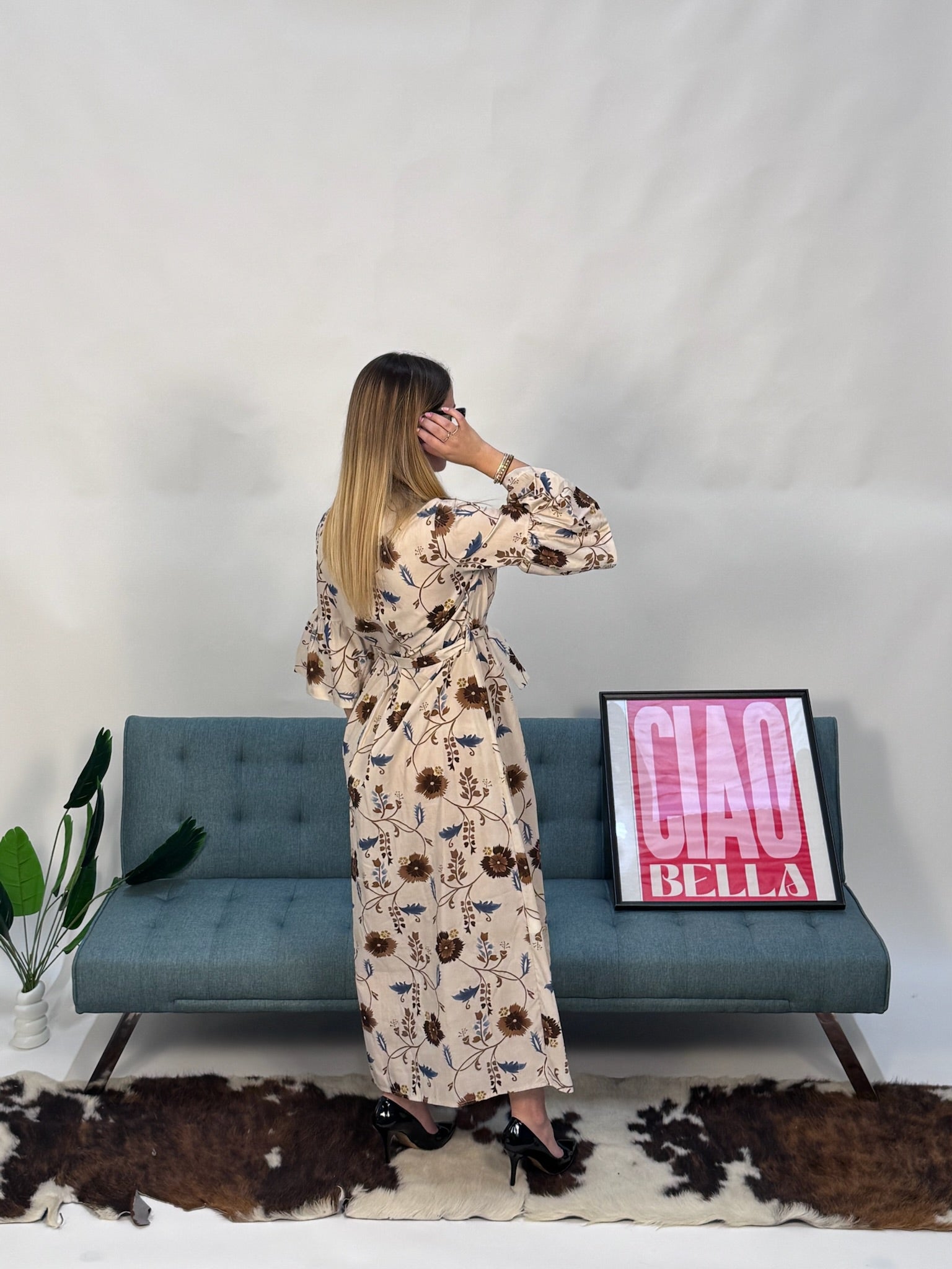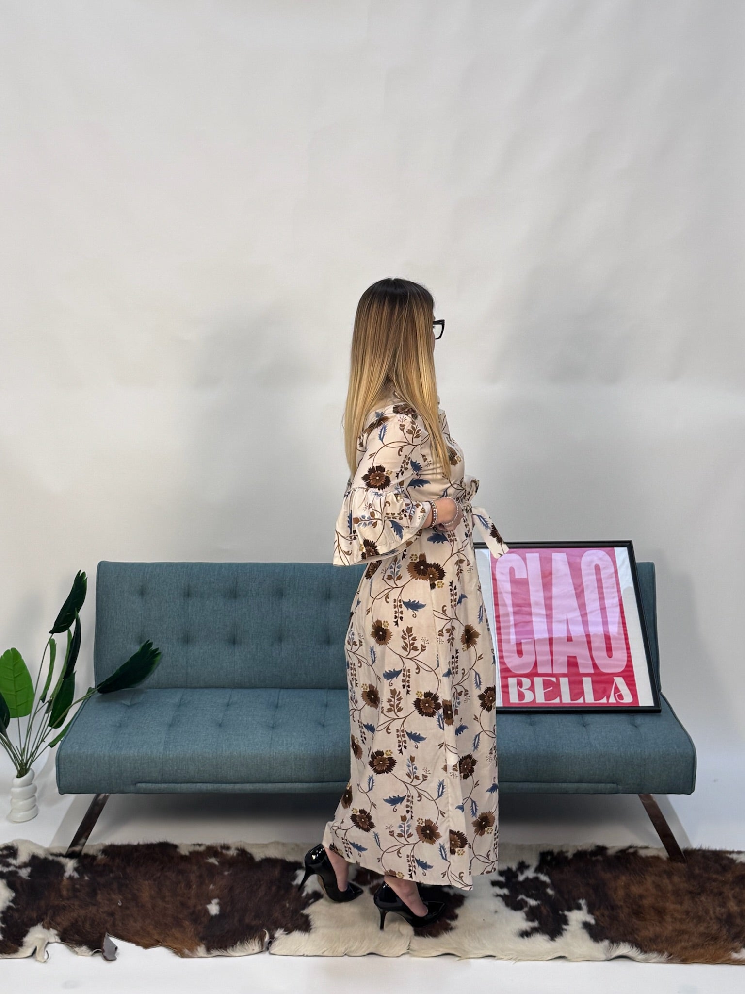 Descrizione: Vestito floreale con bottoni e passanti in vita con cintura. Manica a 3/4 con finale a balza.