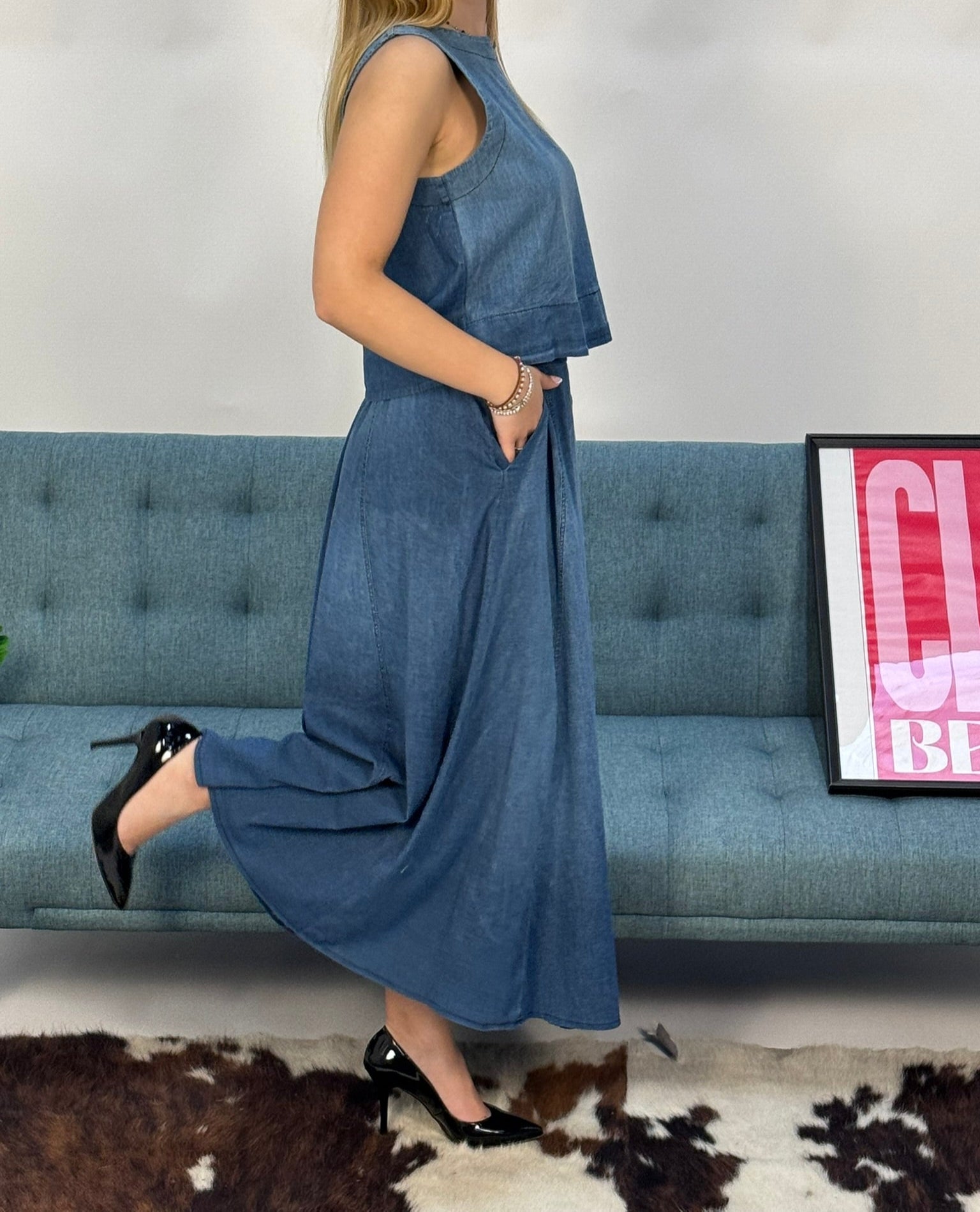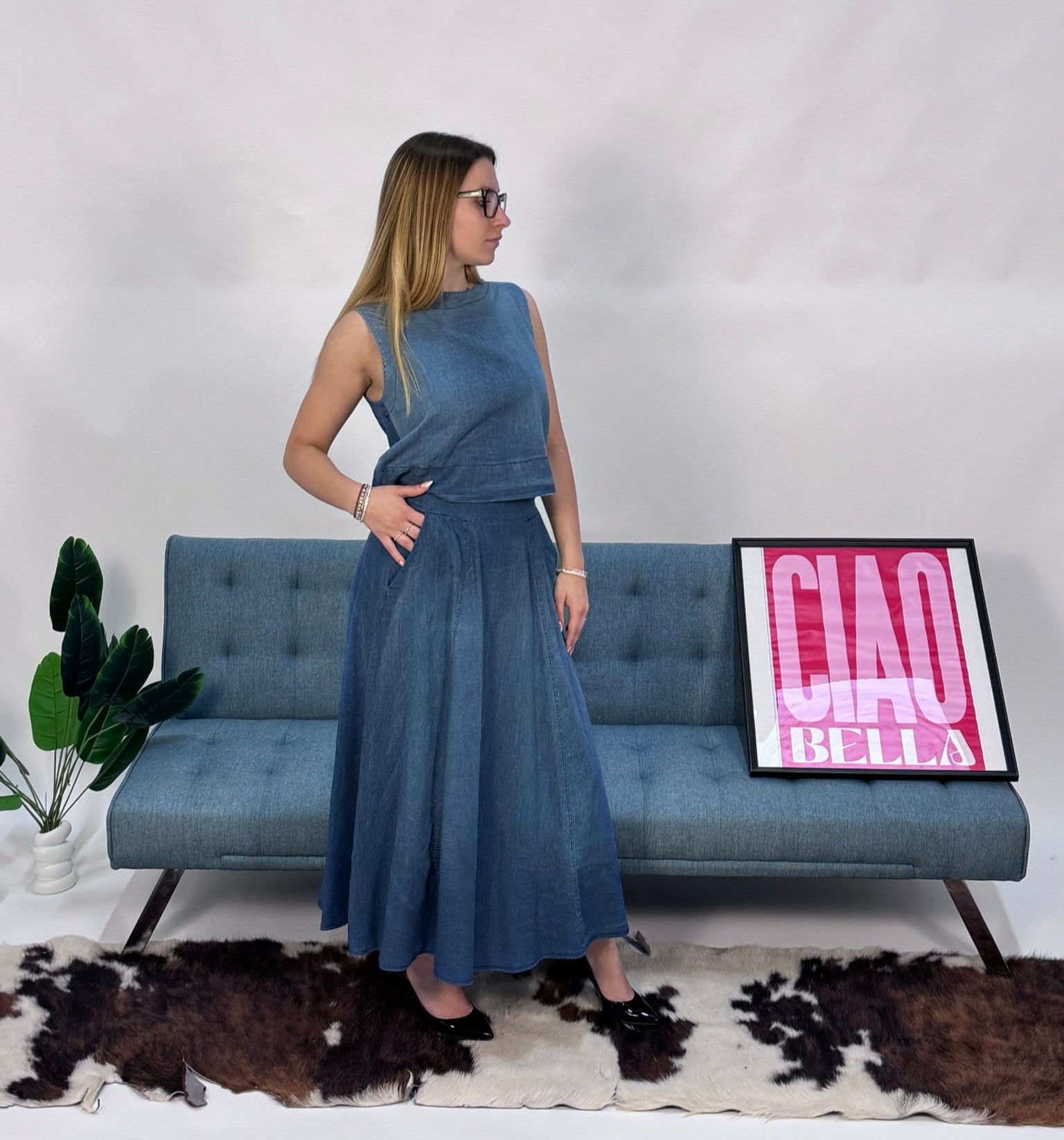Descrizione: Gonna lunga in jeans. Elastico in vita. Possibilità di creare un coordinato con la camicia dello stesso tessuto.